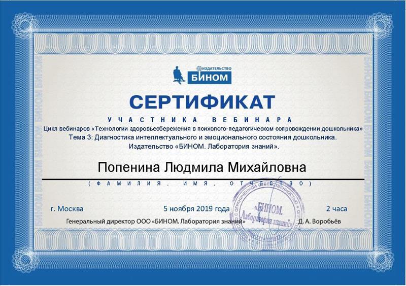 | Сертификат участника в вебинаре Цикл вебинаров "Технологии здоровьесбережения в психолого-педагогическом сопровождении дошкольника". Тема 3: Диагностика интеллектуального и эмоционального состояния дошкольника. Издательство "БИНОМ. Лаборатория знаний". 5 ноября 2019 г. |
